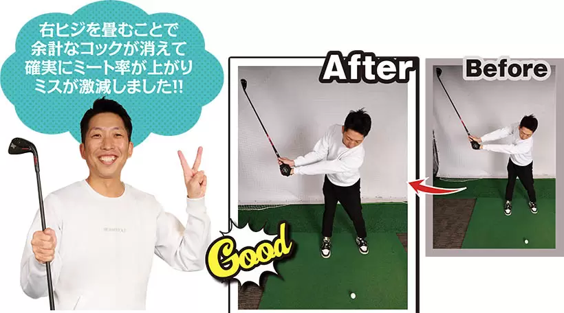 (写真上)右ヒジが伸びたままだとトップで手首の動きが大きくなる!(写真下)コックはこの程度でもOK!右ヒジを畳んだコンパクトなトップに。