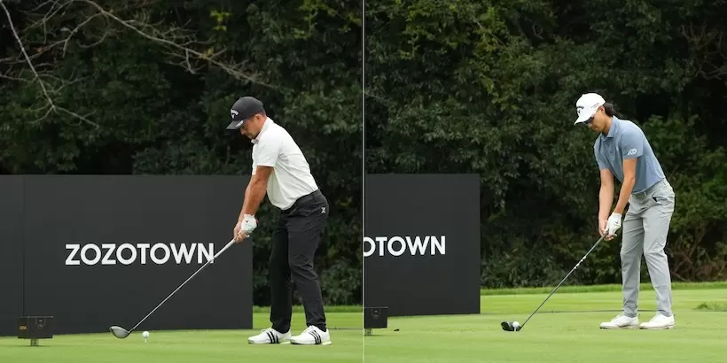 2023年のZOZOチャンピオンシップでのザンダー・シャウフェレ(左)とミンウー・リー(右)のティショットの位置。ほぼ同じ位置で構えている。