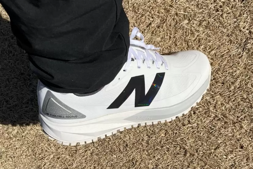2種類の「FuelCellミッドソール」と黒いチキンウイング型のTPUプレートがスイング時と歩行時の安定性を高次元で両立。