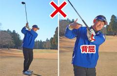 シャローイングを意識しすぎるとトップでクラブヘッドが目標の左を向き(左)、左手首の掌屈が働きやすい(右)。