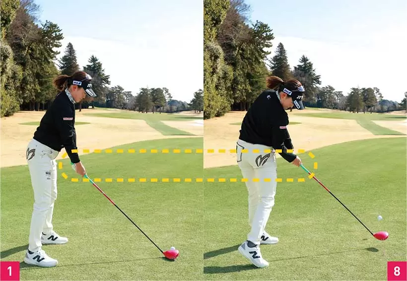 腰の位置も高めで、ほとんどヒザを曲げていない。体の重心がやや高めにあることで回転スピードを上げやすくなる。体重移動するタイプは重心が低い。アドレスとインパクトの手元の位置がほとんど同じなのでクラブのライ角も変わらず、打点が安定する。