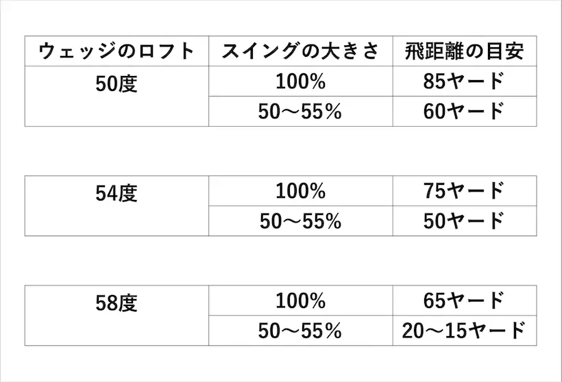 50、54、58度のウェッジ。ハーフスイングだと何ヤード? めっちゃ役立つ打ち分けチャート表作ってみた