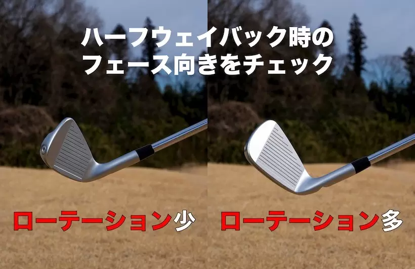 テークバックではフェースが開きながら上がって行き、ダウンスイングからインパクトに向けて開いたフェースが戻り、閉じながら振り抜ける動きがフェースローテーションです。