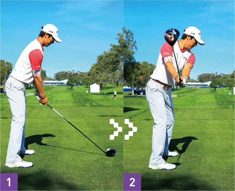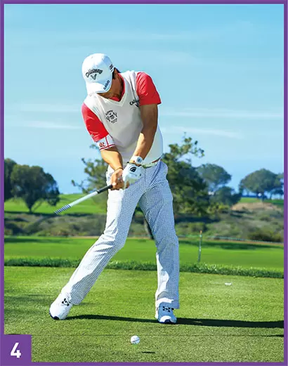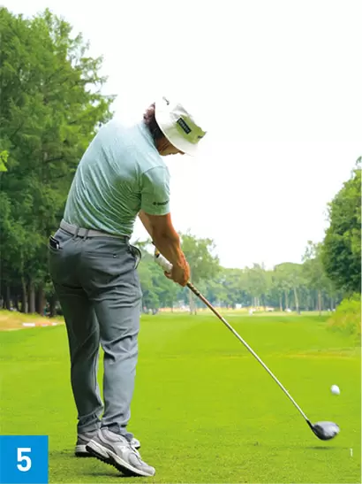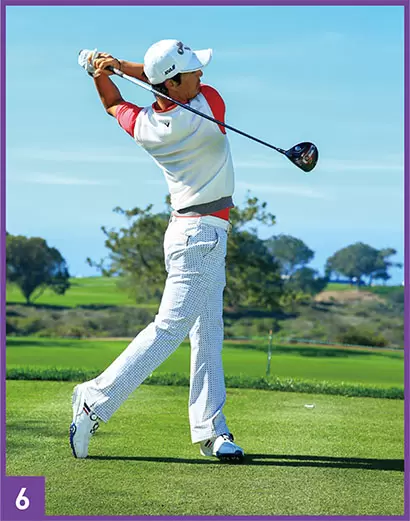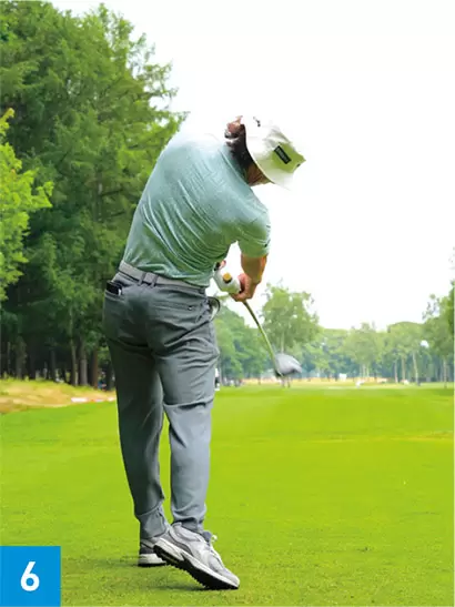 ダウンスイングでは頭の位置を左に戻しながら、左ヒザもヨコに動かしてパワーを出していた。