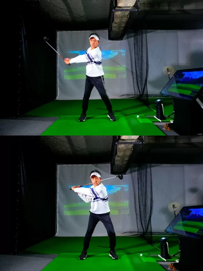 ヘソにクラブがくっついているつもりで体をねじってクラブを上げるのがポイント。
