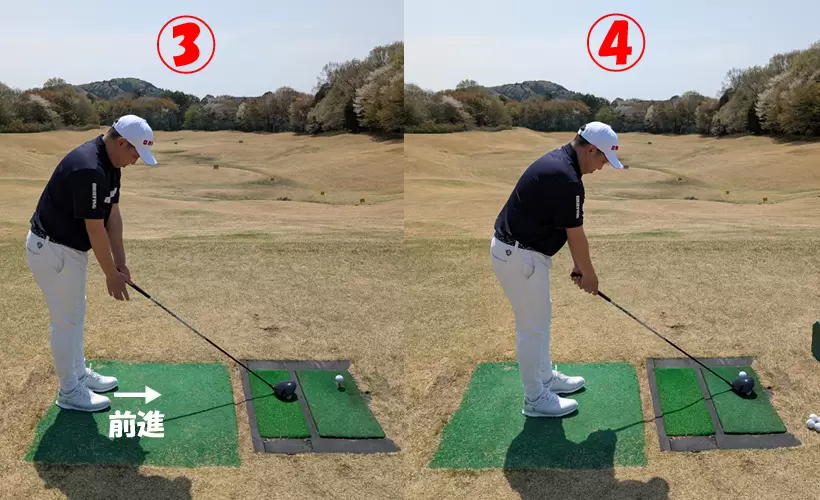 ③(②)の位置でクラブをグリップする。 ④ 前傾をキープしたまま前進してヘッドをボールに合わせる。