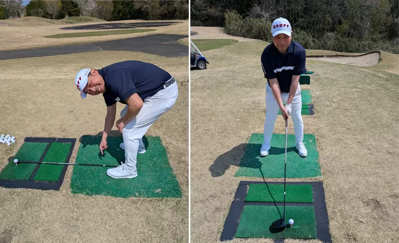 グリップエンドをボールに合わせて、マスキングテープの位置に左足のツマ先を合わせてアドレスすればOK。
