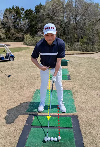 ボールの左右の位置は、ドライバーは左足カカト内側の延長線上。FW、UT、アイアンとボール1コ分ずつ右に寄って行く、そしてアイアンのボールの位置はおヘソの真下になるのが基本的な位置。