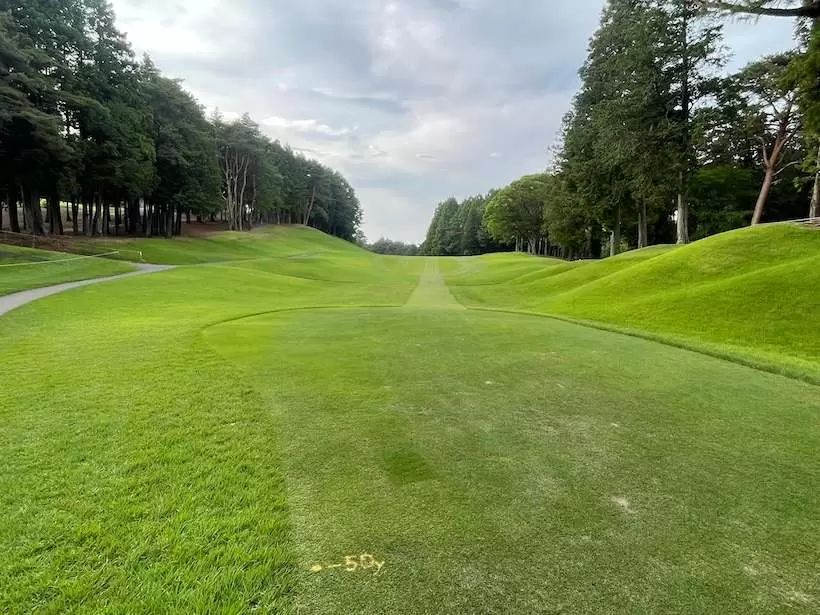 パー4のティーイングエリアに表示された「パー5のティーイングエリアの基準点からマイナス50ヤード」のペイント