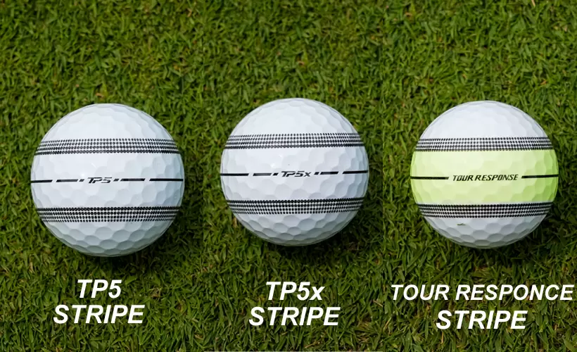 テーラーメイド(写真左から) ●TP5 ストライプ 5ピース、ウレタンカバー、実勢価格(1ダース)7150円 ●TP5x ストライプ 5ピース、ウレタンカバー、実勢価格(1ダース)7150円 ●ツアーレスポンス ストライプ 3ピース、ウレタンカバー、実勢価格(1ダース)6380円 ※カラー違い有り