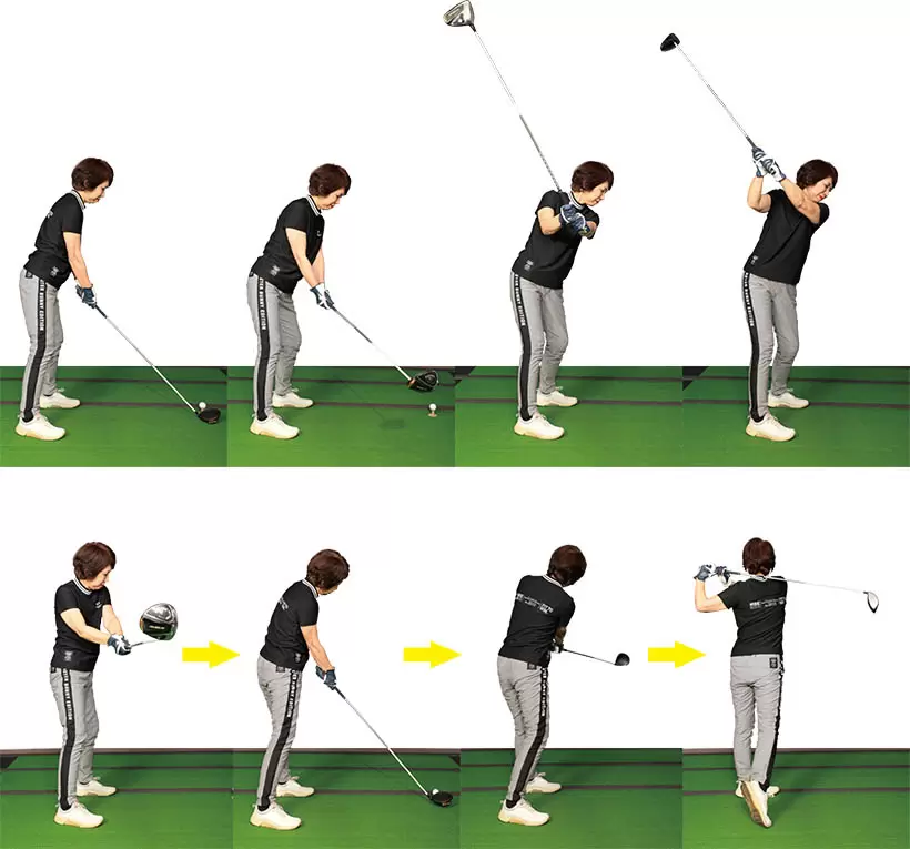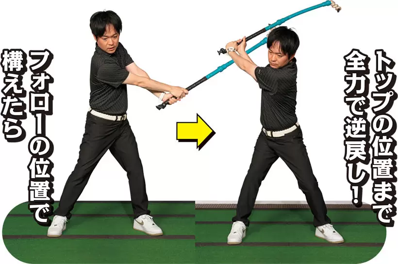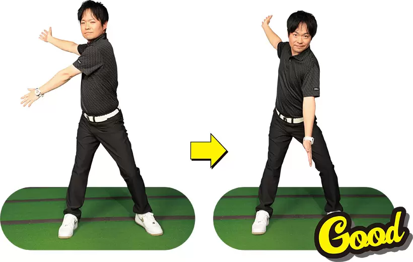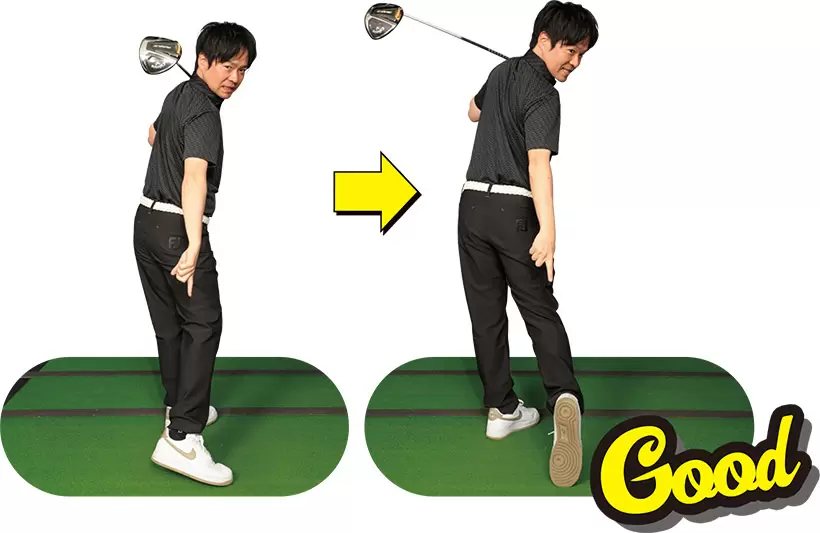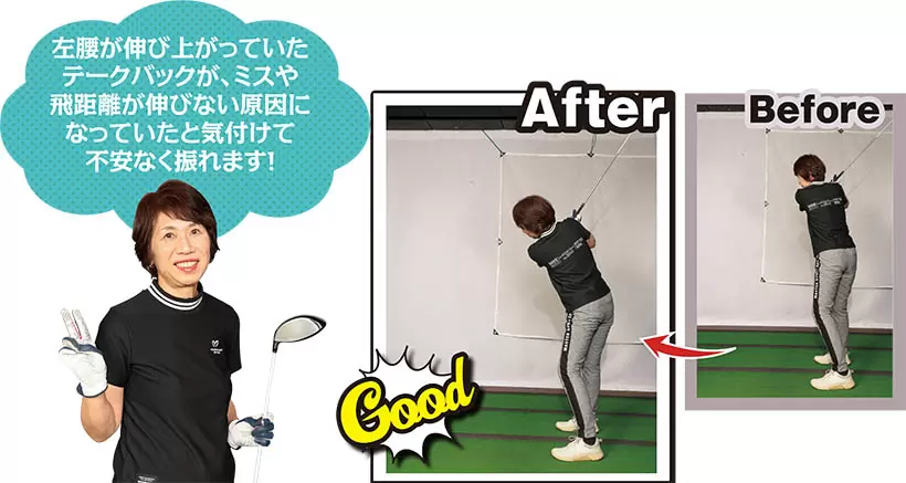 (写真左)左腰が伸び上がり骨盤が起きてしまっているが(写真右)アドレス時の前傾を保ったままテークバック!