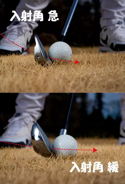 ヘッドの入射角が急だと打点は上になり、入射角が緩いと打点は下になる。