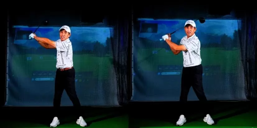 美しいスイングを目指すあまりピンと伸ばした左ヒジが原因でヘッドスピードが出ない(左)左手はギュッと握らず、左ヒジは曲げているくらいでいい(右)。