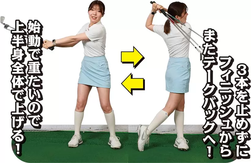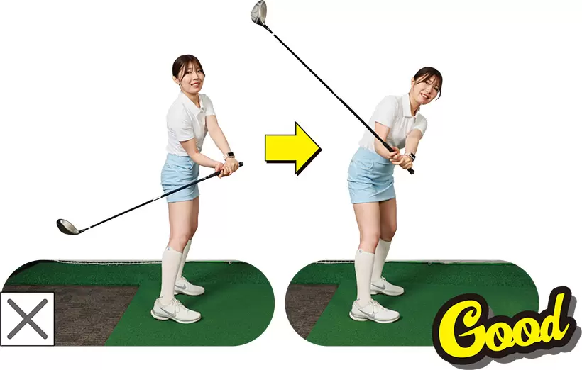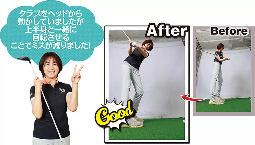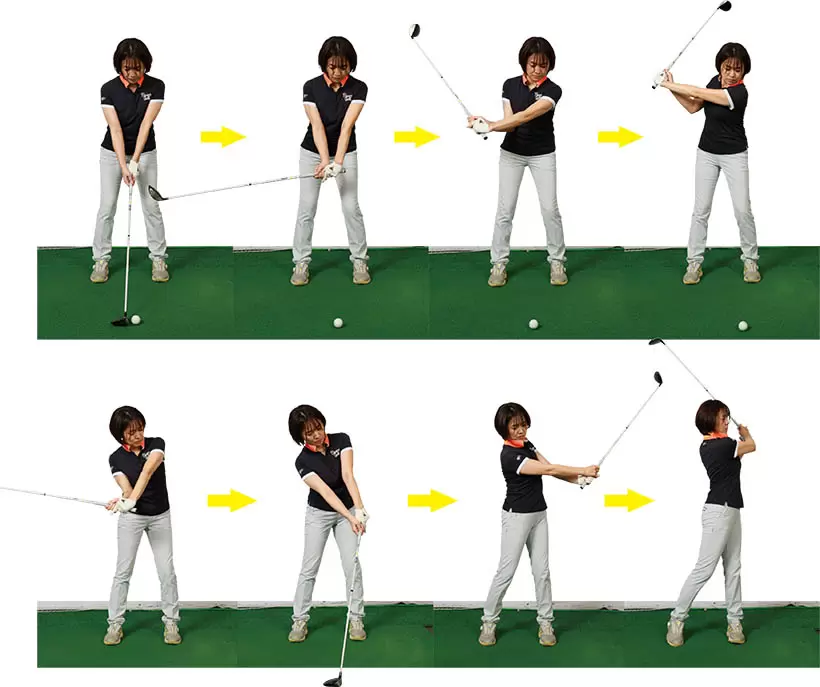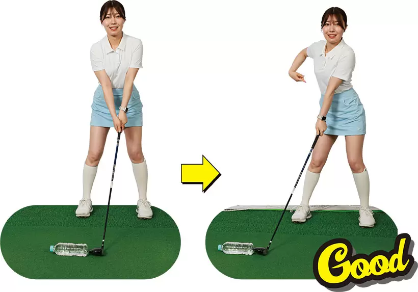 (写真左)手先だけでクラブヘッドを上げているが……(写真右)上半身とクラブを一体化させて上半身全体で上げていくイメージ!
