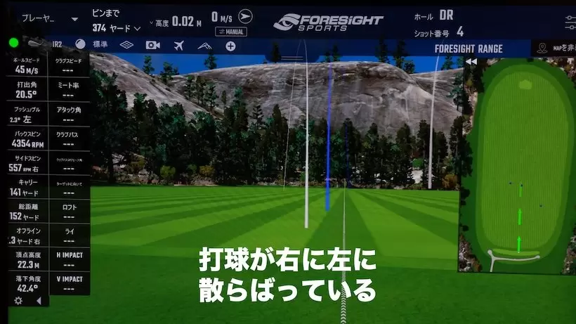 7番の弾道解析結果。マイクラブ(上)は左右のミスが交互に出た。『TB-5フォージド』(中)の2・3球目はナイスショット、『TB-3フォージド』(下)は3球ともやや左に飛んだ。