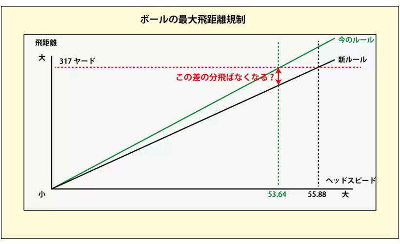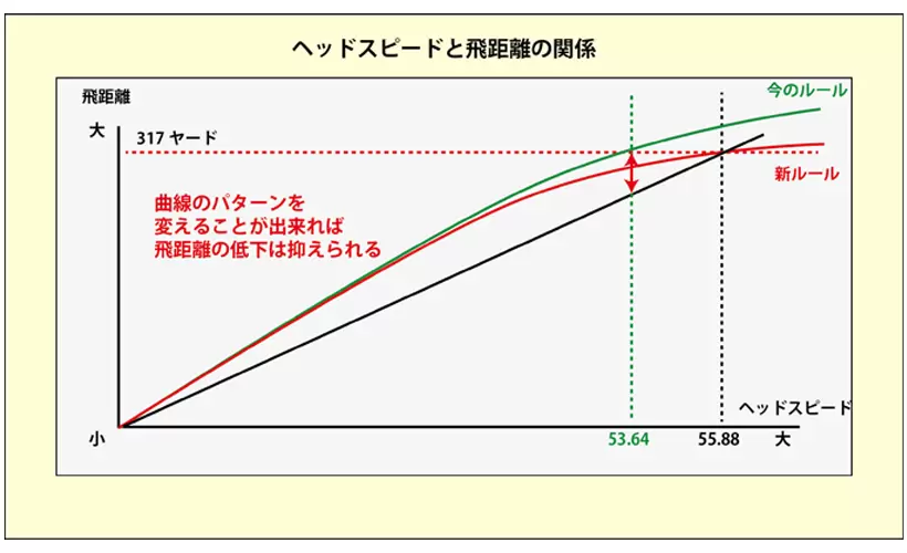 ヘッドスピードと飛距離の関係は直線ではなく曲線を描く。ヘッドスピードが53.64m/sを超えた時に飛距離の増加を抑えるようにボールの特性を変化させれば、ルールが変わっても飛距離の低下は少なく出来る。