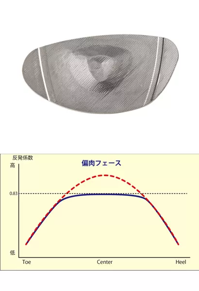 フェースの変形量を衝撃の大小でコントロールすれば、小さな力ではルールに適合させ、大きな力が加わったときには高い反発力を発揮させることが出来る。