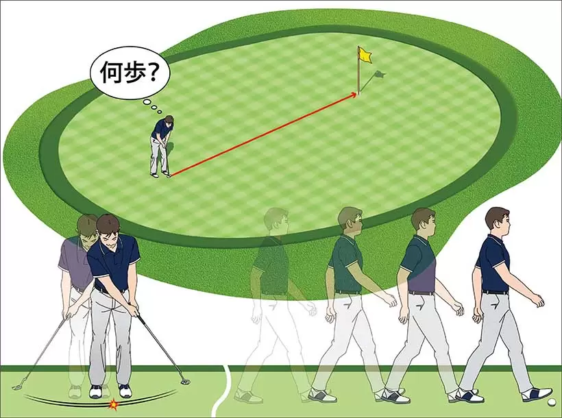 グリーンの速さは日によって変わる。気持ちいいストロークで打って止まった場所まで歩測し、コロがった距離を把握しておくとロングパットを1パット圏内に寄せやすい。