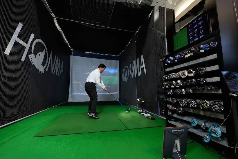 PGA TOUR SUPERSTORE つくば学園東大通り店内のHONMA仕様試打ブース。インショップとは思えないほど広々としたスペースで気持ちよく振り切れる。