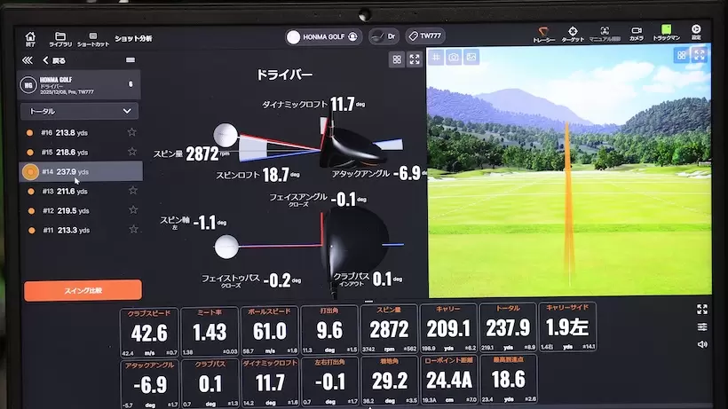 43m/s近いヘッドスピードのわりに飛ばないのはスピン(4500rpm)が多過ぎるせい。「TW777」のフィッティングでどこまで飛距離を伸ばせるか?