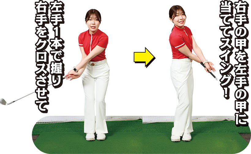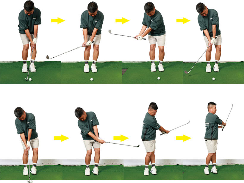 (写真上)左手首を甲側に折る「背屈」の動きがミスの原因に……(写真下)左手首は折らずに腕とシャフトを一体化させる!