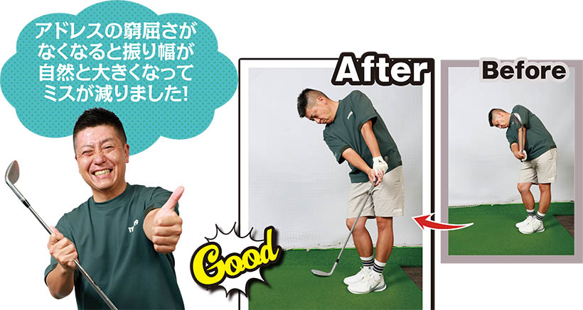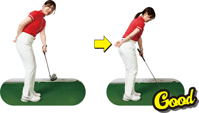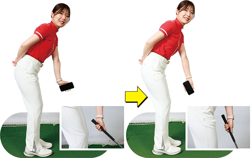 (写真左)手元を下げたアドレスだと手首に角度がつきすぎてしまい背屈の動きの原因に(写真右)手元を下げすぎないように親指から腕、手首までの高さを揃えるように構えましょう