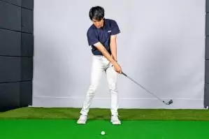 トップで左足に体重を乗せて、そのまま振り抜く!左一軸スイングを取り入れてみましょう