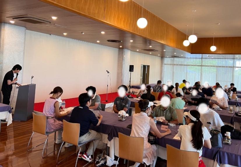 クラブハウスでのチェックイン&受付後、パーティールームで朝の顔合わせミーティングが始まります。